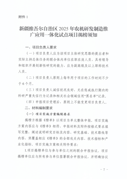 关于发布新疆维吾尔自治区农机研发制造推广应用一体化试点项目“揭榜挂帅”榜单的公告